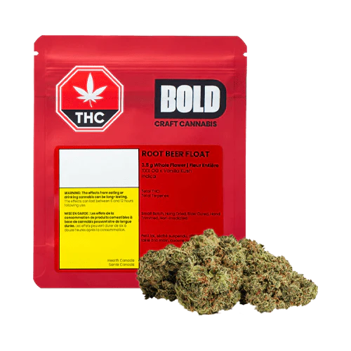 Root Beer Float 14 g whole flower is a rare indica dominant strain created through crossing XXX OG and Vanilla Kush. Enter into a sweet hazy, earthy bliss with hints of lemon and pine aroma. Enjoy the classic Root Beer flavour combined with frothy vanilla notes. BOLD Craft Cannabis is indoor grown, small batch, hang dried, slow cured and hand trimmed. More of the Root Beer Float you know and love.