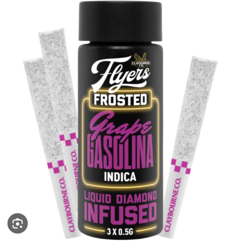 Claybourne Frosted Flyers Infused Grape Gasolina pre-rolls are THCa diamond frosted, terpene enhanced and infused with liquid diamonds. These 3x0.5g pre-rolls are indica-dominant and boast 40-50% THC. Looking for bold flavour and a potent experience? Look no further than Claybourne Frosted Flyers.