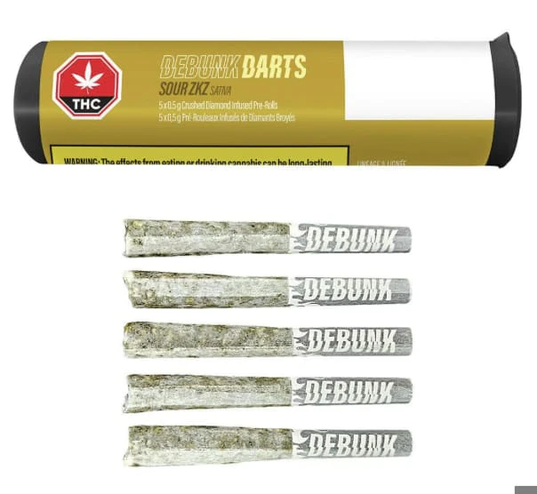 Up your game with DEBUNK Triple Infused Sour ZKZ Darts, a vibrant Sativa that that cuts deep with sharp lemon-lime citrus flavour and subtle earthy notes to balance it out. This 5-pack of darts are Bubble Hash coated and infused with THCa, Liquid Diamonds, and botanical terpenes for maximum flavour and potency. No distillate to be found. Wrapped around high-quality milled flower in a classic 0.5 g format, this iconic cross of ZKZ and Sour Diesel comes in at 40% THC for a pack full of potent pre-rolls.
