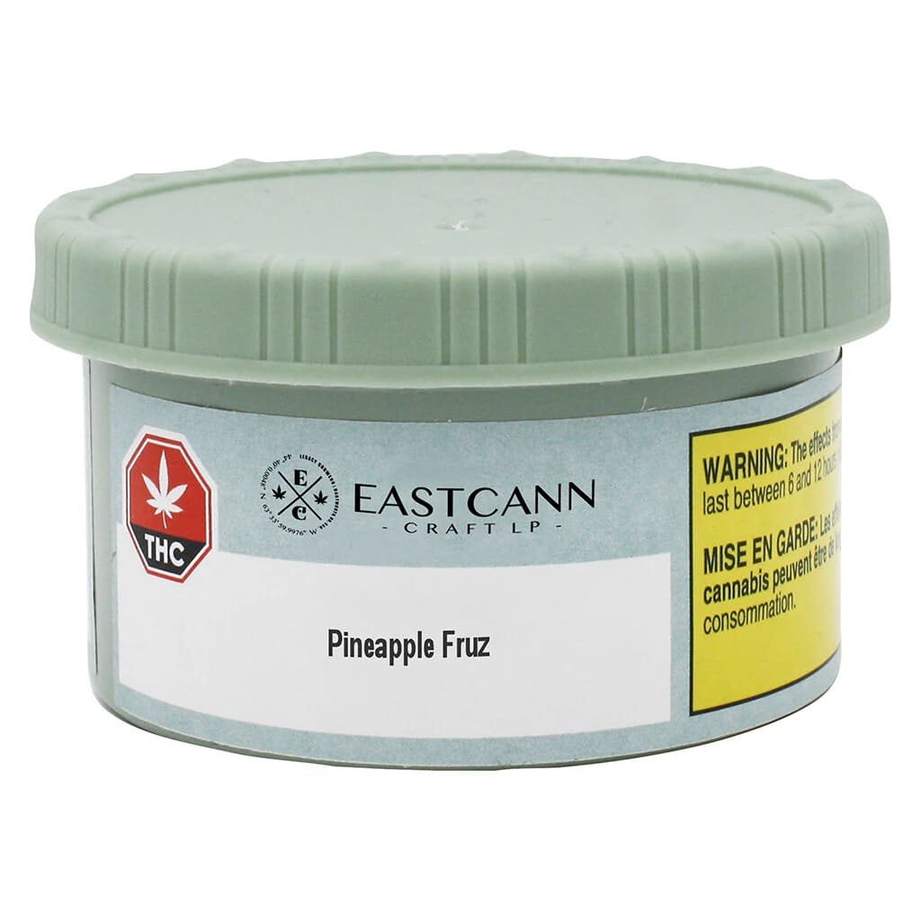 EastCann's Pineapple Fruz is bred by crossing parents Animal Mints X Zkittlez. Pineapple Fruz produces beautiful medium size buds with dark purple hues and a light green base with orange pistols. The frosty trichomes are plentiful throughout the entire bud. This award-winning strain is celebrated for its stunning appearance and strong, syrupy pineapple flavor. Infused with 100% Live Resin Injected to the center of the preroll for an even infusion