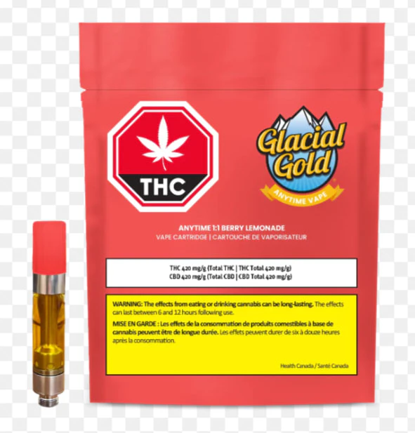 Anytime 1:1 Vape is a balanced CBD and THC profile for new and experienced consumers. Berry Lemonade is inspired by fresh-picked berries and citrus terpenes found in cannabis. The mild botanical terpenes are naturally derived from plant compounds, nothing artificial, and no additives (PG/VG). Glacial Gold distillate is processed through a patented closed loop, chilled-alcohol extraction method. Cartridges are made with stainless steel components and a ceramic atomizer.
