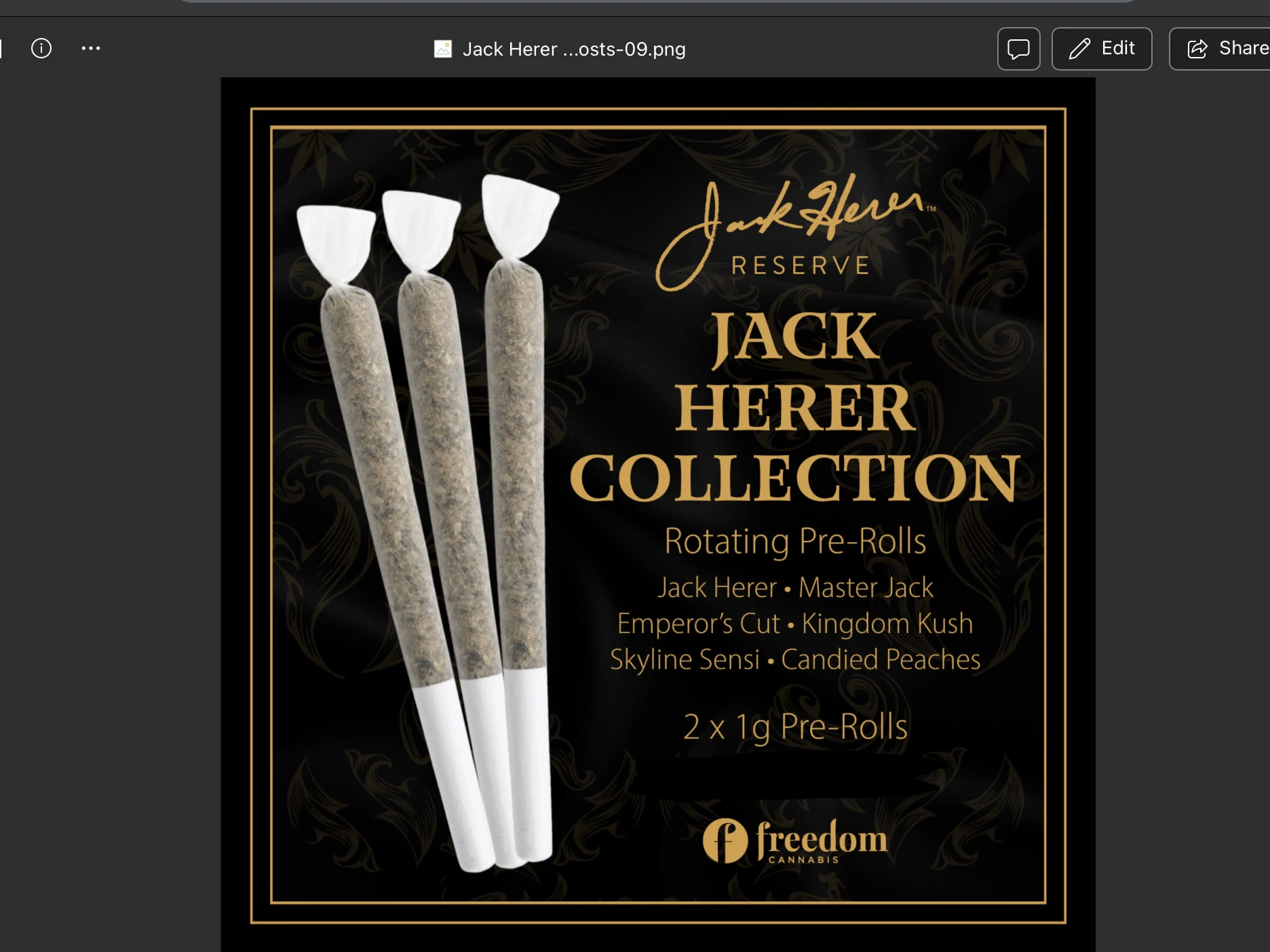 Jack Herer Collection 2x1g Pre-roll - Rotating Strain Two Big Joints. One Legendary Collection. Always Something New. The Jack Herer Collection 2x1g Pre-roll Pack delivers two full-gram joints made with premium indoor-grown flower from one of the iconic cultivars in the Jack Herer lineup. Each release features a rotating strain, giving you a bold, terpene-rich smoke with legendary genetics and standout flavour - but never the same twice. Every 1g pre-roll is hand-finished with cold-cured, whole flower - no trim, no shake - ensuring a smooth burn and potent hit. From citrus haze to gassy peach, each pack brings a fresh experience from among the Collection's signature strains: Jack Herer - The pine-and-lemon classic that started it all Master Jack - Berry-kush evolution of the original Emperor's Cut - Blueberry haze + sweet chem balance Kingdom Kush - Creamy cake and diesel for heavy hybrid fans Skyline Sensi - Pine, citrus, and daytime creative lift Candied Peaches - Juicy, gassy, and loud with vivid colour Strain rotates by batch - check the label for your current cultivar. Key Features 2 x 1g pre-rolls made with indoor-grown, cold-cured flower Rotating strain selection from the Jack Herer Collection Whole flower only - never trim or shake Premium papers, smooth draw, even burn Balanced to bold effects depending on strain The legacy, in full grams. Whether you're a Jack fan or just exploring the fire, this rotating 2-pack delivers size, quality, and serious flavour.