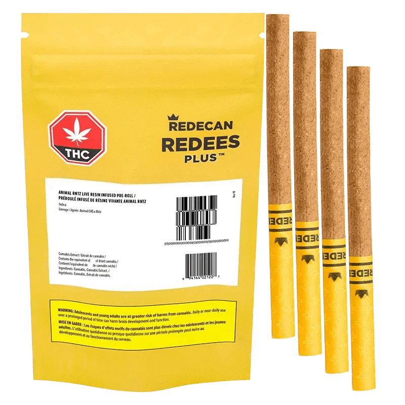Twice the beast, double the bite. Animal RNTZ Redees Plus Live Resin Infused Pre-Rolls takes our legendary Animal Cookies x Rntz indica and supercharges it with pure Animal RNTZ live resin, packed into our iconic Redees for a next-level smoking experience. Rolled into 4 x 0.5g straight-cut pre-rolls, these ultra-potent hitters are rolled right making them clock in at a ferocious 42-50% THC, delivering true-to-strain flavours and effects in every perfectly packed puff.